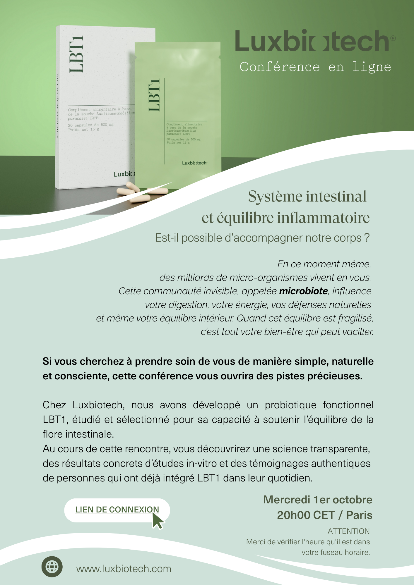 Chez Luxbiotech, nous avons développé un probiotique fonctionnel LBT1, étudié et sélectionné pour sa capacité à soutenir l’équilibre de la flore intestinale. Au cours de cette rencontre, vous découvrirez une science transparente, des résultats concrets d’études in-vitro et des témoignages authentiques de personnes qui ont déjà intégré LBT1 dans leur quotidien.